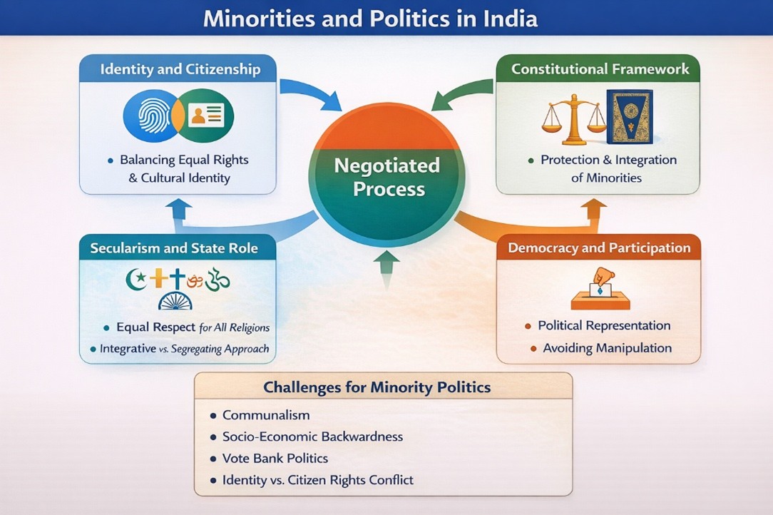 • इस दृष्टिकोण से अल्पसंख्यक राजनीति को केवल संघर्ष या अधिकारों की मांग के रूप में नहीं, बल्कि एक निरंतर विकसित होने वाली प्रक्रिया के रूप में समझा जाना चाहिए।