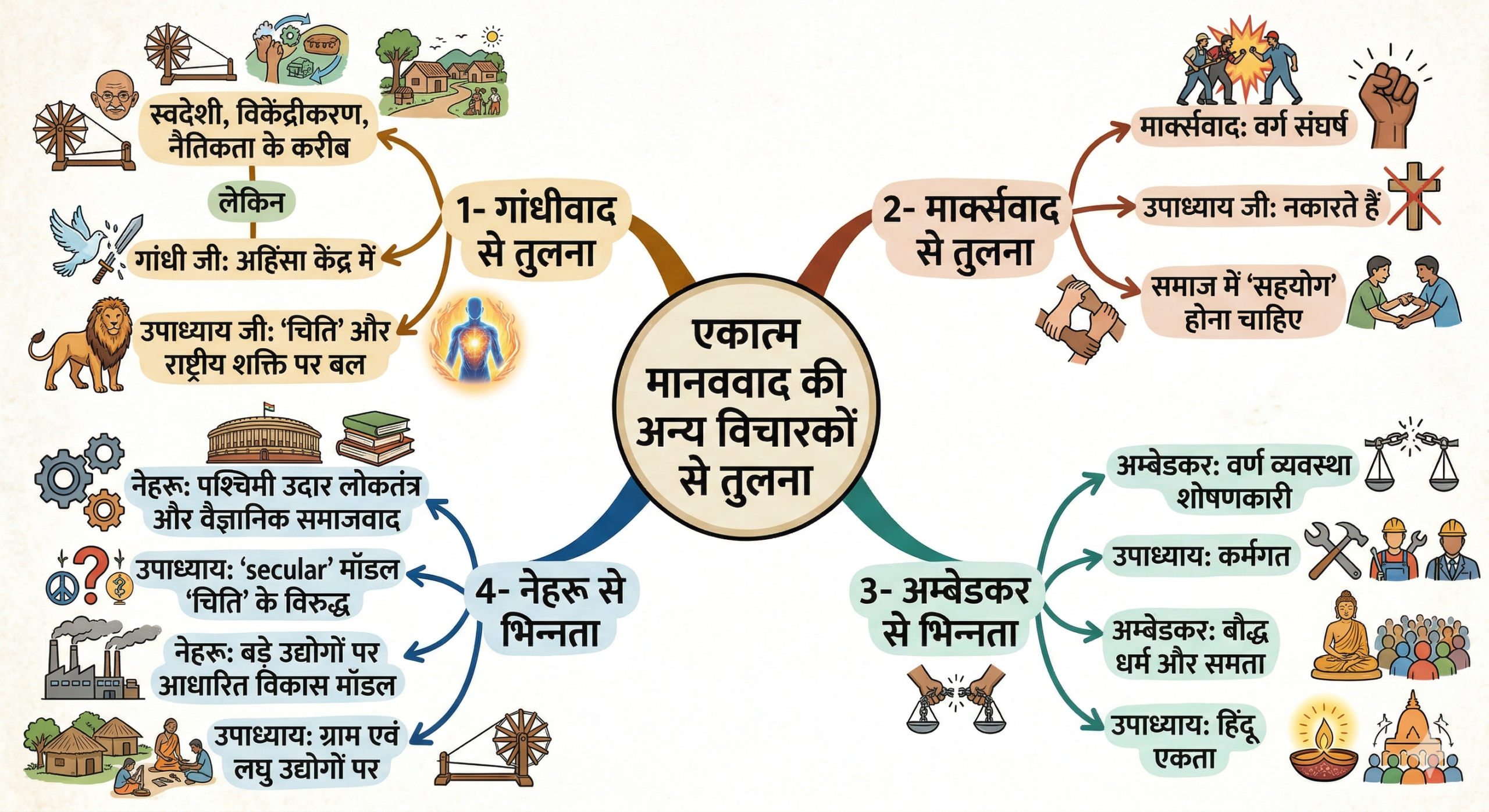 1- गांधीवाद से तुलना: एकात्म मानववाद गांधी जी के स्वदेशी, विकेंद्रीकरण और नैतिकता के विचारों के काफी करीब है। हालांकि, गांधी जी ‘अहिंसा’ को केंद्र में रखते हैं, जबकि उपाध्याय जी ‘चिति’ और राष्ट्रीय शक्ति पर अधिक बल देते हैं।