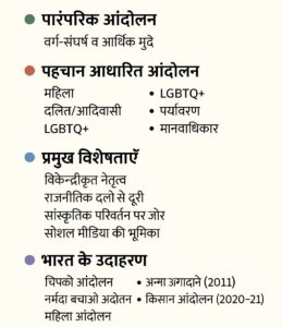 - पारंपरिक आंदोलनों से अलग, जिनका फोकस वर्ग-संघर्ष व आर्थिक मुद्दे थे।