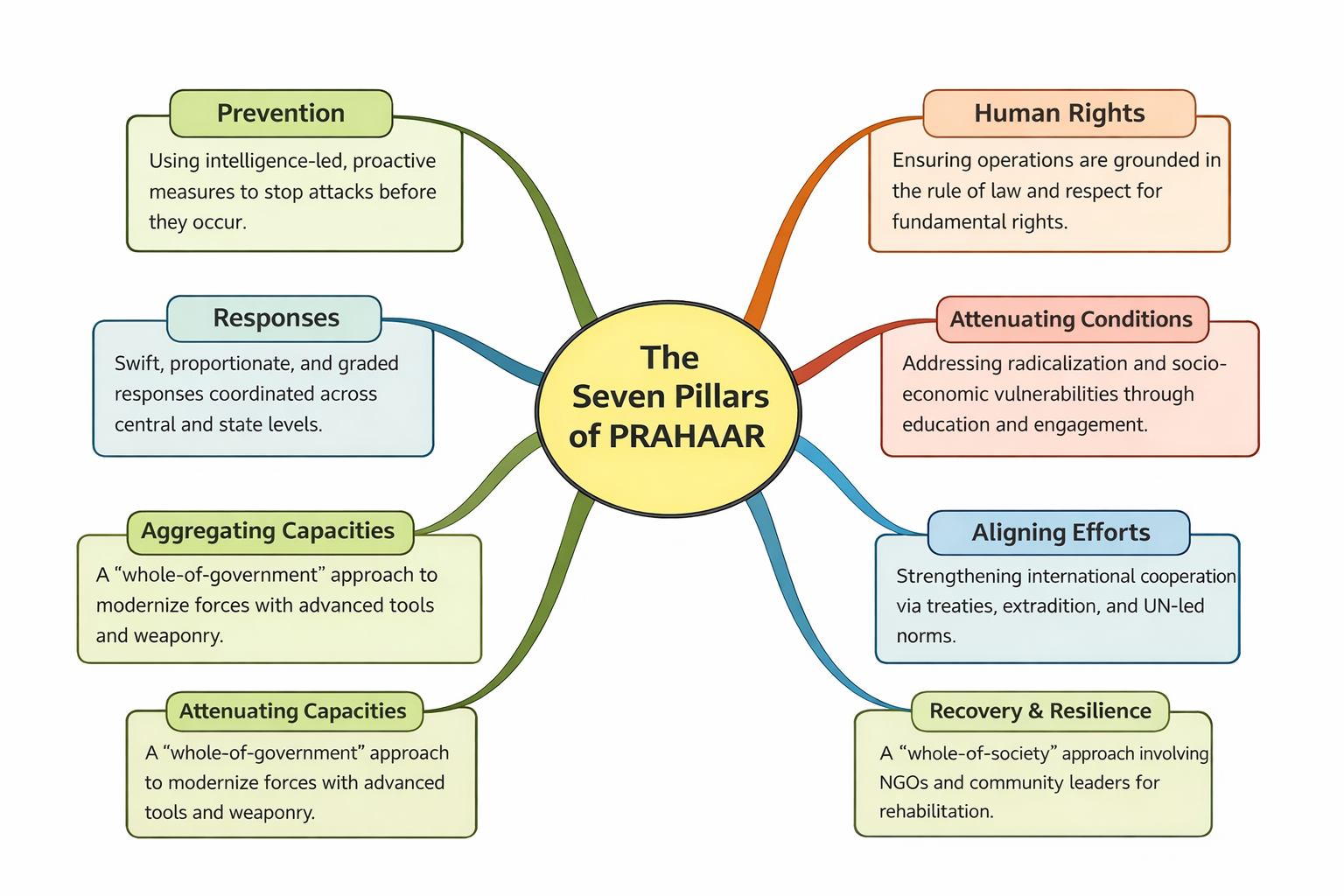 1- दृष्टिकोण में परिवर्तन: प्रहार से पूर्व भारत के आतंक-रोधी प्रयास विभिन्न कानूनों (जैसे यूएपीए) और एजेंसियों (जैसे एनआईए) तक सीमित और खंडित माने जाते थे। प्रहार इस बिखरे हुए ढांचे को समाप्त कर एकीकृत राष्ट्रीय सिद्धांत प्रदान करता है।