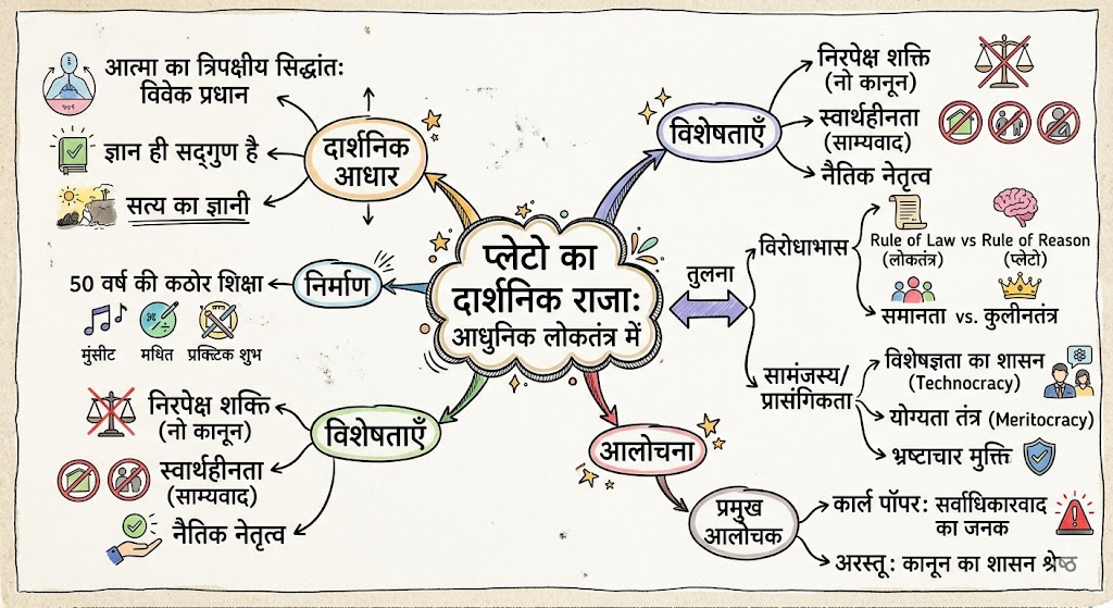 विशेष नोट:परीक्षा में उत्तर लिखते समय यह स्पष्ट करना आवश्यक है कि प्लेटो का राजा ‘स्वार्थी तानाशाह’ नहीं है। वह अपनी इच्छा से शासन नहीं करता, बल्कि ‘सत्य’ के प्रति अपने कर्तव्य के कारण शासन का बोझ उठाता है। आधुनिक संदर्भ में, हम प्लेटो के ‘विशेषज्ञता’ और ‘नैतिकता’ के मूल्यों को तो अपना सकते हैं, लेकिन उसकी ‘निरंकुशता’ को नहीं।