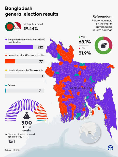 निर्वाचन आयोग द्वारा घोषित परिणामों के अनुसार, तारिक रहमान के नेतृत्व वाली बांग्लादेश नेशनलिस्ट पार्टी (BNP) ने संसद की 300 सीटों में से 212 पर जीत दर्ज कर स्पष्ट बहुमत प्राप्त किया है। यह जीत बीएनपी के लिए एक दशक से अधिक समय के निर्वासन और राजनीतिक दमन के बाद एक बड़ी वापसी है। चुनाव का सबसे महत्वपूर्ण और चर्चा का विषय जमात-ए-इस्लामी का प्रदर्शन रहा है, जिसने 77 सीटें जीतकर स्वयं को एक अनिवार्य राजनीतिक शक्ति के रूप में स्थापित किया है।