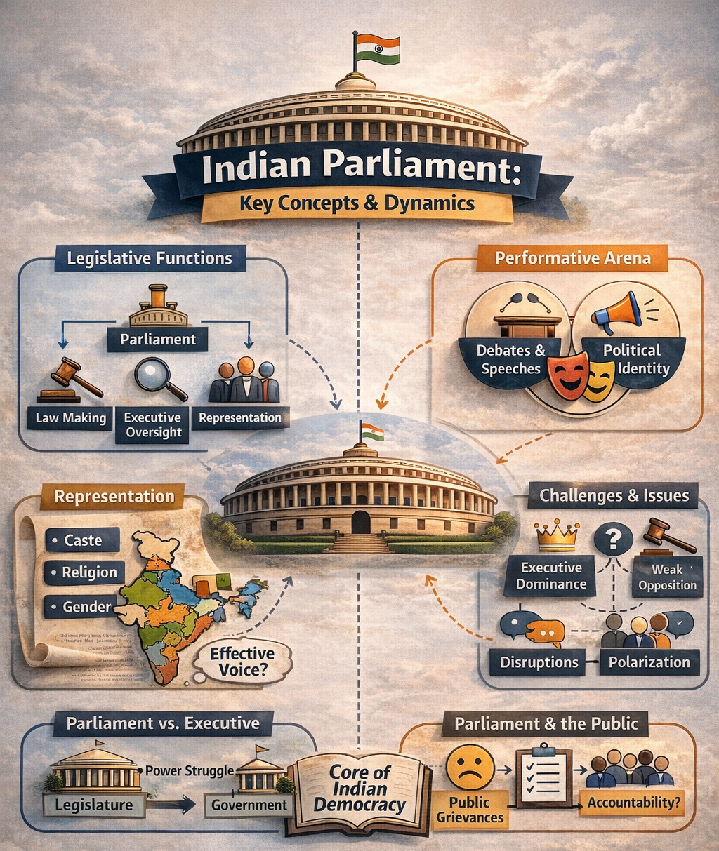इस प्रकार संसद केवल प्रतिनिधित्व का मंच नहीं, बल्कि प्रतिनिधित्व की गुणवत्ता का परीक्षण स्थल भी है।