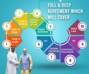 - व्यापक आर्थिक भागीदारी समझौता (CEPA): 2022 में दोनों देशों ने CEPA पर हस्ताक्षर किए, जो भारत द्वारा किसी खाड़ी देश के साथ किया गया पहला ऐसा समझौता था। इस समझौते का उद्देश्य अगले पांच वर्षों में द्विपक्षीय गैर-तेल व्यापार को 100 बिलियन डॉलर तक पहुँचाना है। इससे भारतीय निर्यातकों को यूएई के बाजारों में शून्य शुल्क पहुंच प्राप्त हुई है।