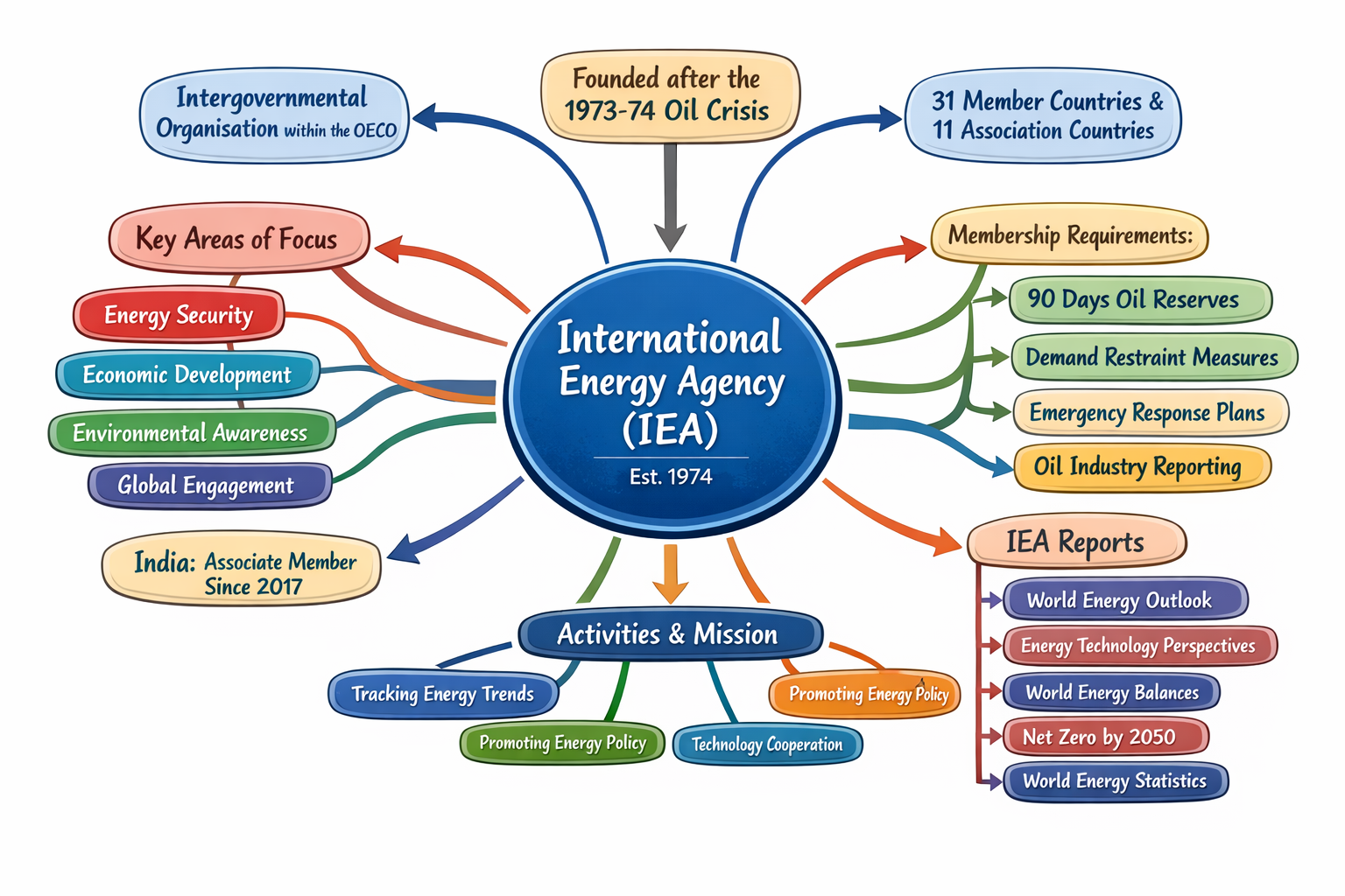 IEA की स्थापना 1974 के ‘तेल संकट’ (Oil Crisis) के जवाब में की गई थी। उस समय ओपेक (OPEC) देशों द्वारा तेल निर्यात पर लगाए गए प्रतिबंधों ने विकसित देशों की अर्थव्यवस्थाओं को हिलाकर रख दिया था। जवाब में, विकसित देशों ने ऊर्जा सुरक्षा सुनिश्चित करने के लिए एक सामूहिक तंत्र विकसित किया। दशकों तक यह संस्था केवल आर्थिक सहयोग और विकास संगठन (OECD) के अमीर देशों का एक क्लब मानी जाती रही।
