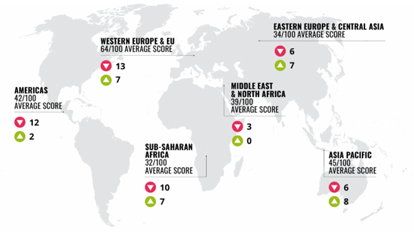 - वैश्विक औसत में गिरावट: एक दशक से अधिक समय में पहली बार वैश्विक औसत घटकर 100 में से 42 रह गया। अधिकांश देशों (182 में से 122) का स्कोर 50 से नीचे है, जो गंभीर भ्रष्टाचार समस्याओं को दर्शाता है।