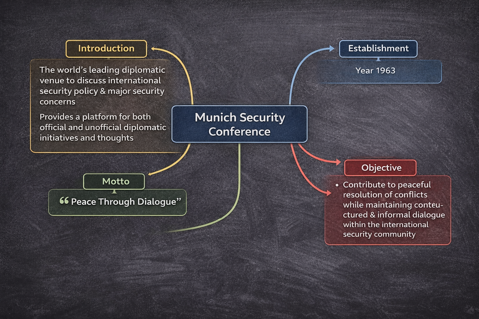- भारत की भूमिका: भारत को ‘विश्व-मित्र’ और एक ‘नेट सुरक्षा प्रदाता’ (Net Security Provider) के रूप में देखा गया। म्यूनिख में भारतीय नेतृत्व ने तर्क दिया कि जब तक वैश्विक संस्थानों (UNSC) में सुधार नहीं होता, तब तक कोई भी विश्व व्यवस्था ‘वैध’ नहीं मानी जाएगी।
