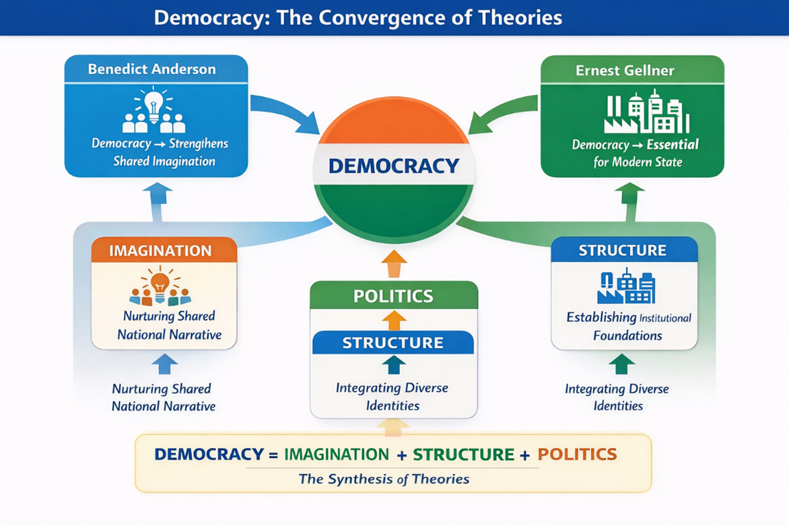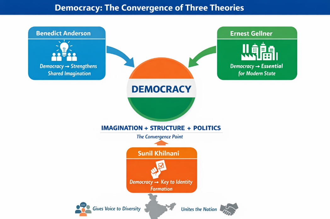 इस पूरी प्रक्रिया में लोकतंत्र एक केंद्रीय भूमिका निभाता है। यह न केवल विविधताओं को अभिव्यक्ति देता है, बल्कि उन्हें एक साझा राष्ट्रीय ढाँचे में भी समाहित करता है। इस प्रकार लोकतंत्र, Anderson की ‘imagination’, Gellner की ‘structure’ और Khilnani की ‘politics’ का वास्तविक संगम बन जाता है।