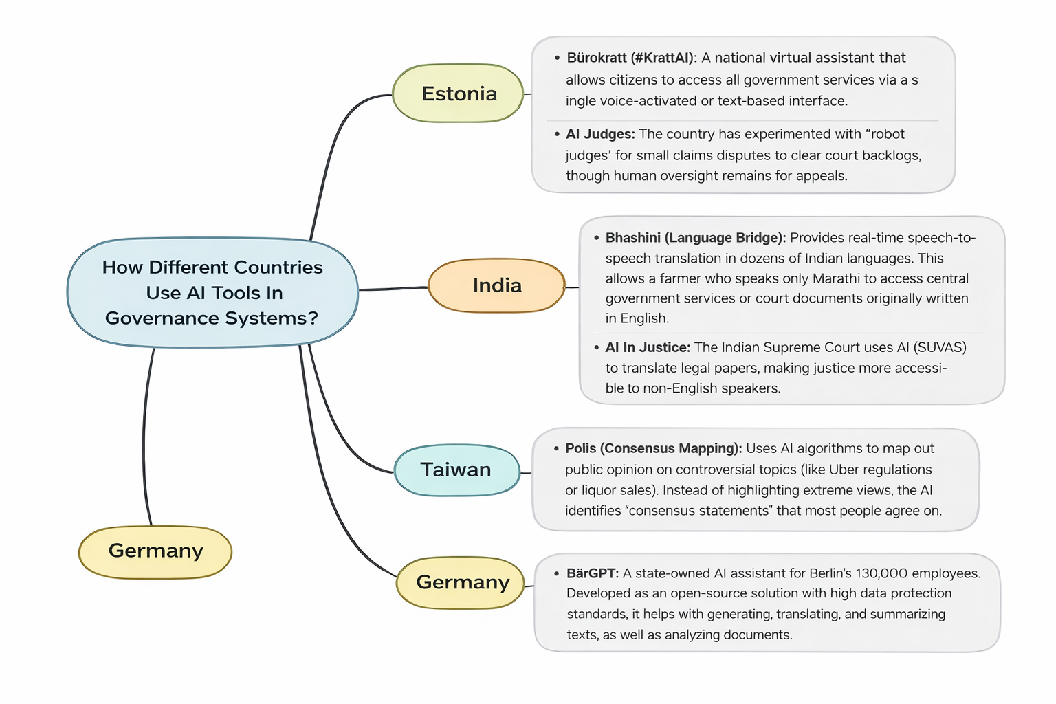 - एस्टोनिया इस क्षेत्र में वैश्विक अग्रणी है, जिसने ‘Bürokratt’ (#KrattAI) नामक एक राष्ट्रीय वर्चुअल असिस्टेंट विकसित किया है, जो नागरिकों को एक ही इंटरफ़ेस के माध्यम से सभी सरकारी सेवाओं तक पहुँच प्रदान करता है। वहाँ छोटे मुकदमों के निपटारे के लिए ‘AI जजों’ का प्रयोग भी किया गया है।