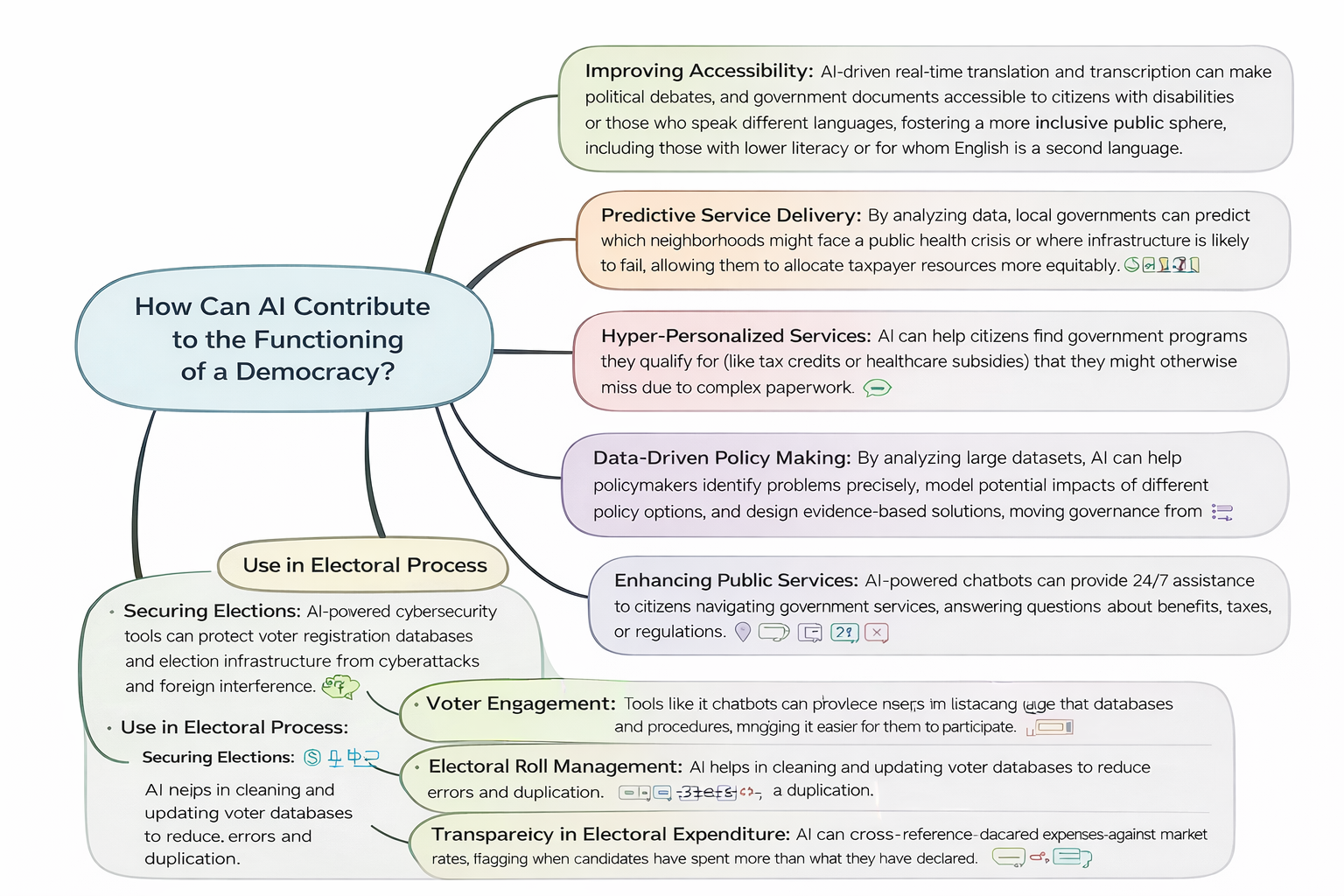 - चुनावी प्रक्रिया में उपयोग: AI चुनावी बुनियादी ढांचे को साइबर हमलों से सुरक्षित करने, मतदाता सूची को त्रुटिहीन बनाने, मतदाताओं को उम्मीदवारों की जानकारी देने और चुनावी खर्च में पारदर्शिता लाने (मार्केट रेट से मिलान कर) में सहायक सिद्ध होता है।
