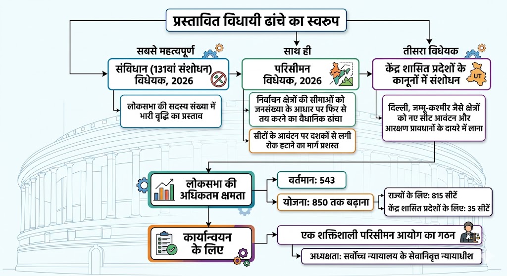 - इसके साथ ही ‘परिसीमन विधेयक, 2026’ निर्वाचन क्षेत्रों की सीमाओं को जनसंख्या के आधार पर फिर से तय करने का एक वैधानिक ढांचा प्रदान करता है। यह दशकों से सीटों के आवंटन पर लगी रोक को हटाने का मार्ग प्रशस्त करता है।