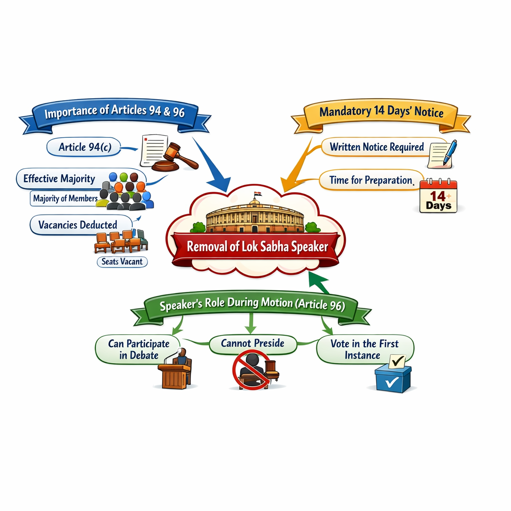 - ये ऐतिहासिक उदाहरण स्पष्ट करते हैं कि अध्यक्ष के विरुद्ध अविश्वास प्रस्ताव लाना केवल एक व्यक्ति को हटाने की कोशिश नहीं होती, बल्कि यह सदन के भीतर असंतोष को व्यक्त करने का एक शक्तिशाली संसदीय हथियार भी है।