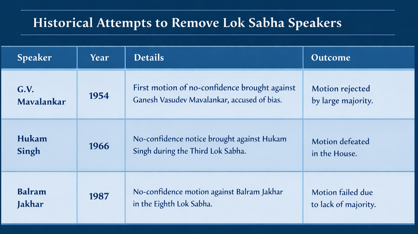 - सबसे पहला प्रयास 1954 में प्रथम अध्यक्ष जी.वी. मावलंकर के विरुद्ध किया गया था, जिसे भारी बहुमत से अस्वीकार कर दिया गया।