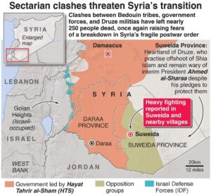 चर्चा का कारण: जुलाई 2025 में सीरिया के सुवेदा (Sweida) प्रांत में द्रूज मिलिशिया और सुन्नी खानाबदोश जनजातियों (बदौइन) के बीच भीषण सांप्रदायिक हिंसा हुई। इस संघर्ष में मरने वालों की संख्या शुरुआत में 30-40 बताई गई थी, लेकिन अंततः यह संख्या 1,000 से 2,000 के बीच पहुंच गई।इज़राइल ने भी इस क्षेत्र में सैन्य हस्तक्षेप किया।