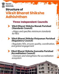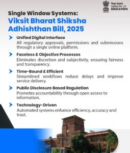विकसित भारत शिक्षा अधिष्ठान विधेयक का मूल उद्देश्य शिक्षा के मानकों में एकरूपता लाना, अत्यधिक विनियमन को समाप्त करना, और अनुसंधान को प्रोत्साहन देना है। इसके तहत एक शक्तिशाली केंद्रीय निकाय, संभवतः ‘विकसित भारत शिक्षा अधिष्ठान’ (VBES), की स्थापना का प्रस्ताव है जो वर्तमान में कार्यरत अनेक नियामक निकायों (जैसे UGC, AICTE, आदि) के कार्यों को समेकित करेगा।यह केंद्रीकृत नियामक संरचना एक दोहरी धार वाली तलवार है।