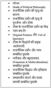 - तब रॉल्स ने इस सोच को चुनौती दी और दर्शन को नैतिक दृष्टिकोण के साथ पुनः राजनीतिक विज्ञान में स्थापित किया।