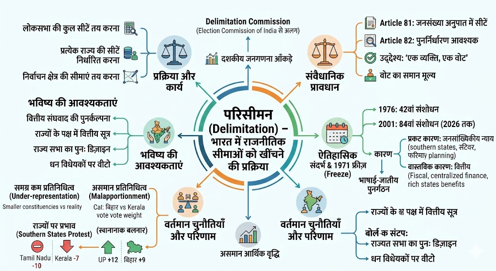 डिलिमिटेशन (Delimitation) राजनीतिक सीमाओं को खींचने की प्रक्रिया है। भारतीय राजनीति में इसका अर्थ तीन कार्यों से है—लोकसभा की कुल सीटों की संख्या तय करना, प्रत्येक राज्य को मिलने वाली सीटों की संख्या निर्धारित करना, और प्रत्येक निर्वाचन क्षेत्र की सीमाओं का निर्धारण करना। यह कार्य Delimitation Commission द्वारा किया जाता है, जो Election Commission of India से अलग है, और इसके लिए दशकीय जनगणना के आँकड़ों का उपयोग किया जाता है। यह प्रक्रिया समय-समय पर इसलिए दोहराई जाती है क्योंकि विभिन्न राज्यों में जनसंख्या समान रूप से नहीं बढ़ती या घटती, जिसका कारण प्रजनन दर और प्रवासन में भिन्नता है।