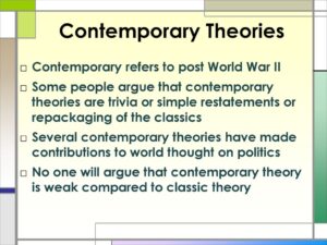 Contemporary refers to post World War II. Some people argue that contemporary theories are trivia or simple restatements or repackaging of the classics. Several contemporary theories have made contributions to world thought on politics. No one will argue that contemporary theory is weak compared to classic theory.