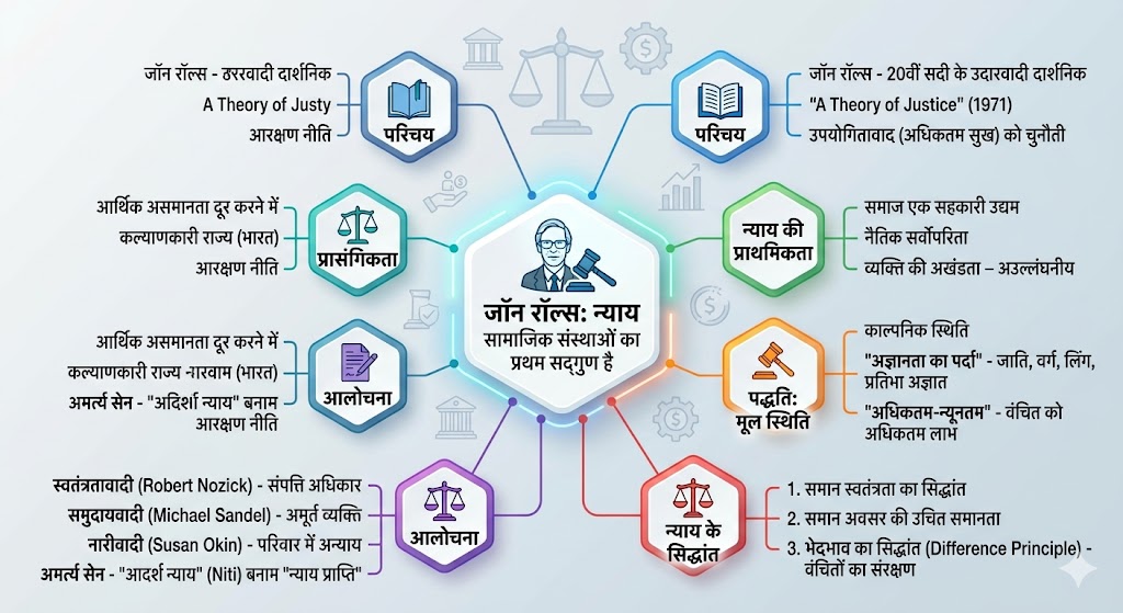• नैतिक सर्वोपरिता: रॉल्स के लिए न्याय केवल एक प्रशासनिक औपचारिकता नहीं, बल्कि एक नैतिक अनिवार्यता है।